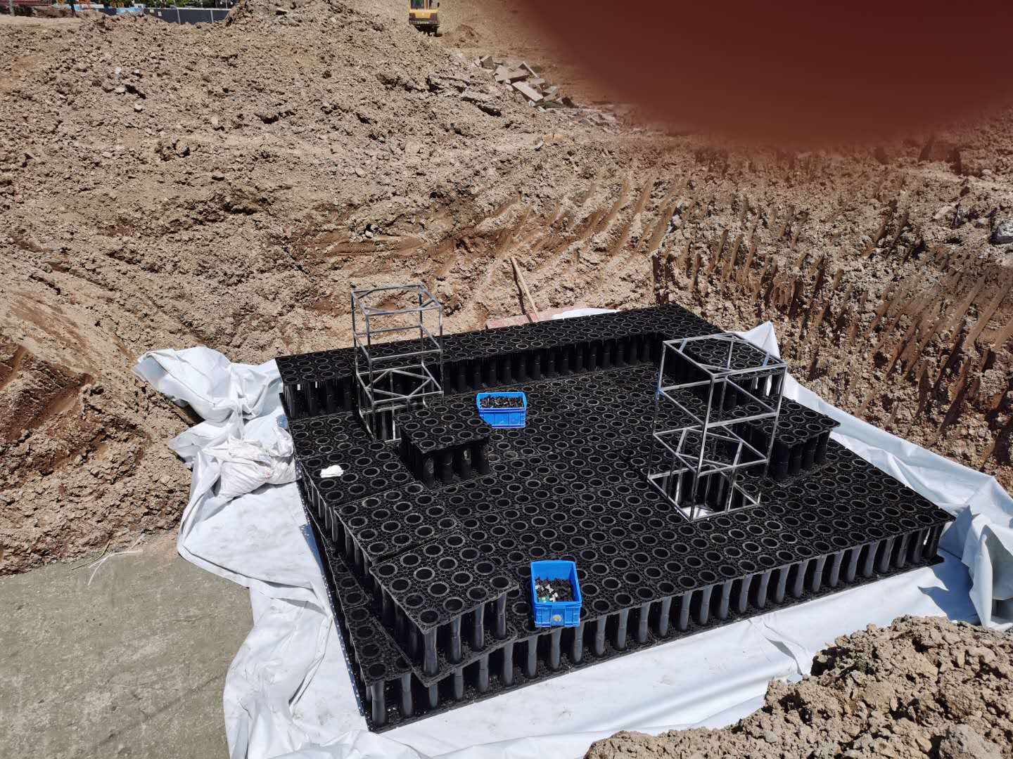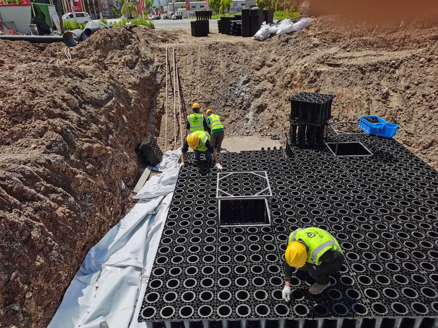 該項目雨水收集回用系統采用地埋PP模塊組合水池的方式收集雨水,前期經過截污掛籃裝置、棄流過濾裝置,后期通過地埋一體機過濾,消毒,最終使水質達到規范標準,用于園區綠地的澆灑,景觀補水,道路沖洗等。